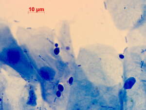non-albicans candida fertőzés, metilénkék festés, Zeiss Axiolab A1 mikroszkóp – dr Ujházy András felvétele
